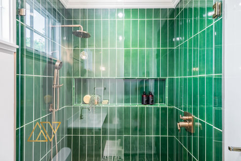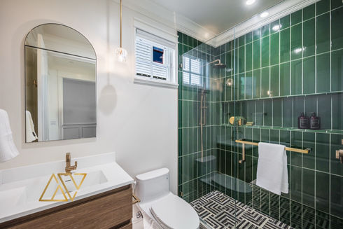 This bathroom remodel in Burlingame was designed to evoke a sense of refined luxury while making a bold visual statement. The centerpiece of the space is a striking walk-in shower clad in deep green wall tiles, creating a rich, moody backdrop that anchors the entire design.