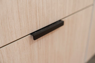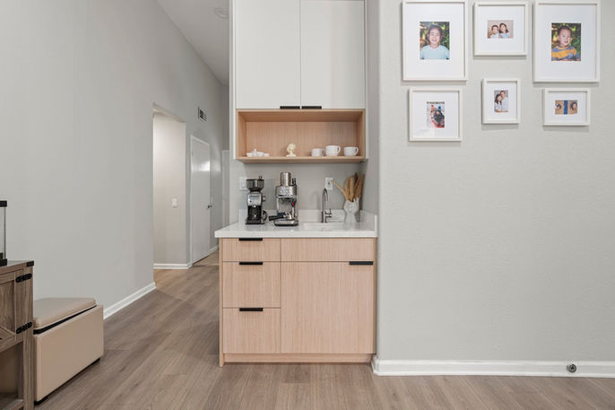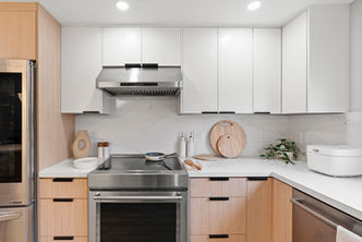 White walls and new light-toned flooring further open the space, contributing to the airy, minimalist aesthetic. A full-slab backsplash adds a modern touch. With visual flow, the newly installed oven is seamlessly integrated between the base cabinets. Though the kitchen’s original structure was retained, the thoughtful redesign dramatically enhances the sense of space—making it feel noticeably larger, brighter, and more modern.