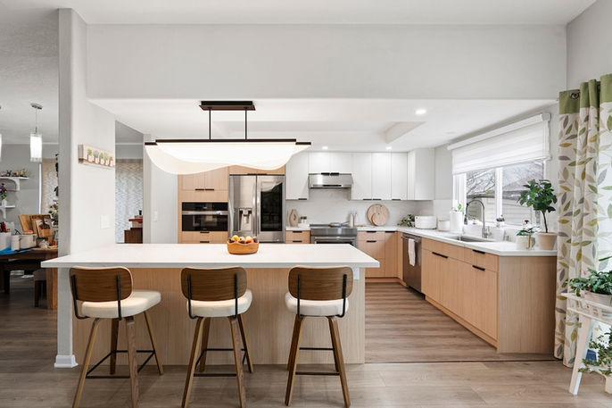 The design highlights a classic two-tone cabinet palette: crisp white upper cabinets that reflect light and warm oak-toned lower cabinets that ground the space with natural texture. A distinctive pendant light over the peninsula introduces sculptural interest and defines the transitional area between prep and dining zones. Complementing the layered lighting scheme, recessed ceiling lights offer clean, even illumination throughout.