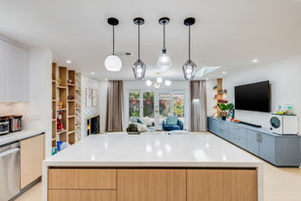 At the heart of the kitchen, a waterfall island creates a bold architectural statement. One side of the island is finished in a sophisticated blue tone, thoughtfully coordinated with the custom cabinetry in the living room for a cohesive flow throughout the space. Elegant pendant lighting above the island adds both functionality and visual interest.